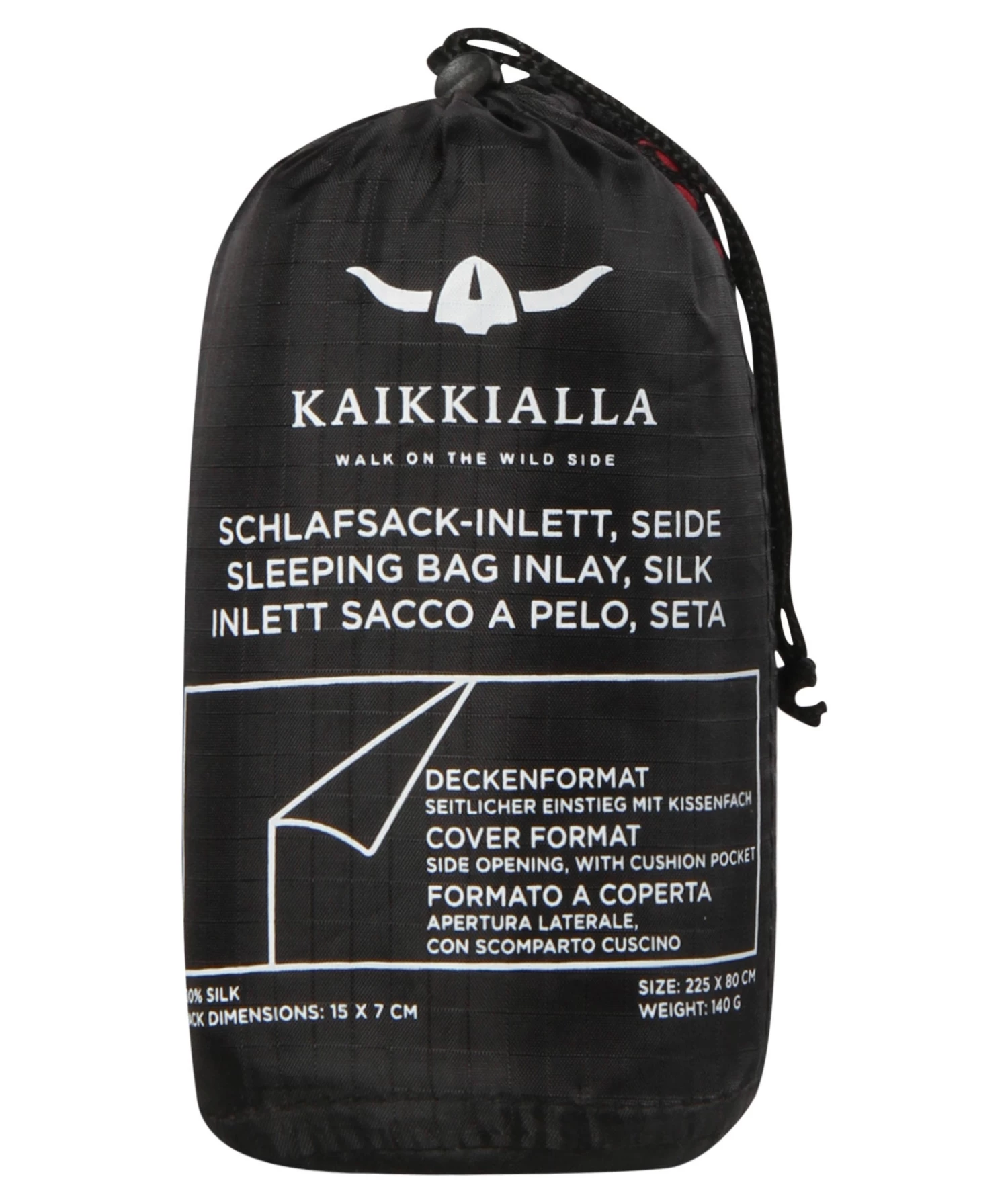 Der ST01-KK ISO ASKA Schlafsack-Inlett aus Seide präsentiert sich im praktischen Deckenformat, seitlichem Einstieg und Kissenfach.